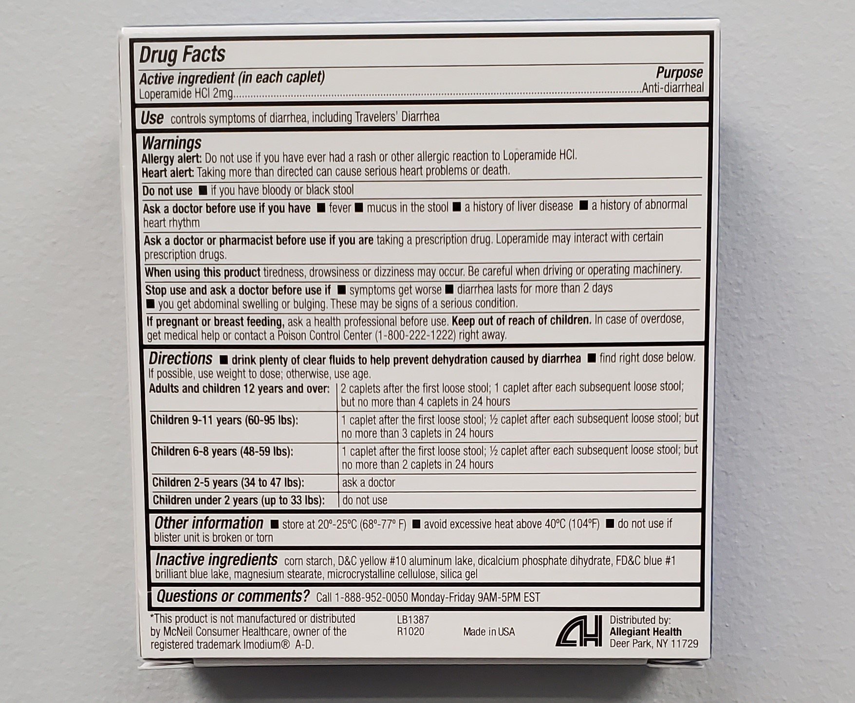 - Active ingredient in each caplet: Loperamide HCI 2mg for anti-diarrheal