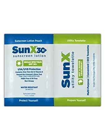SunX SPF30 Sunscreen Lotion Foil Packs with Towelette provide convenient, single-use sun protection for outdoor workers, athletes, and emergency responders. Each foil pack includes one dose of broad-spectrum SPF30 sunscreen lotion and a dry utility towelette for easy application and cleanup. The water-based formula contains Aloe Vera and Vitamin E to soothe and moisturize skin while protecting against harmful UVA and UVB rays.